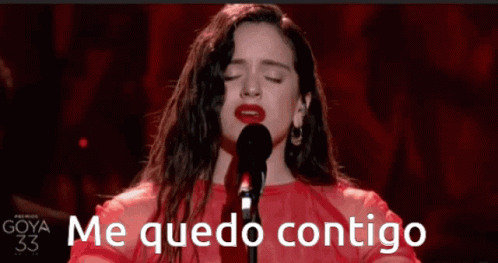 Rosalía performing 'Me Quedo Contigo' at the Goya Awards, singing passionately into a microphone.
