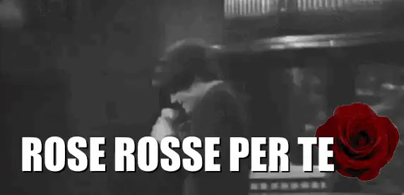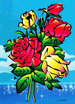 A vibrant, stylized drawing of a bouquet of red and yellow roses against a blue background.
