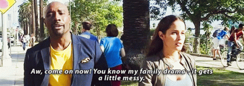 a man and a woman are standing on a sidewalk and the man is saying aw come on now