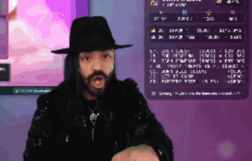 Rosh, a man with long hair and a beard, wearing a hat and sparkly jacket, points directly at the camera.