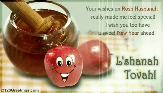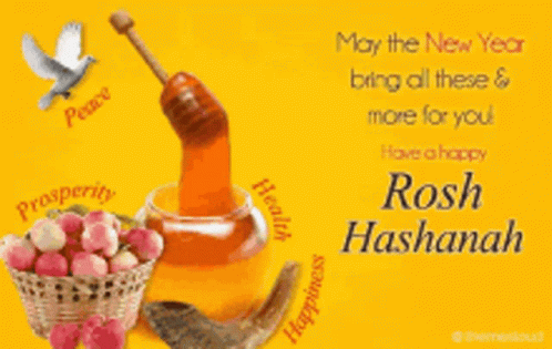 A vibrant greeting card wishing a happy Rosh Hashanah, featuring symbols of peace, prosperity, health, and happiness.