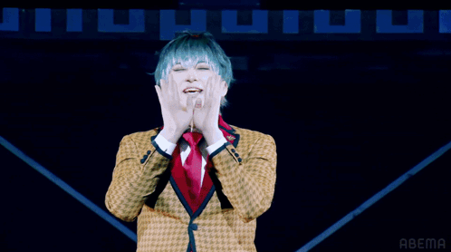 two men stand on stage in front of a large screen which says abema