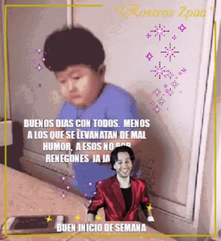 A happy boy dances with a 'Buenos Dias' message, wishing a good start to the week.