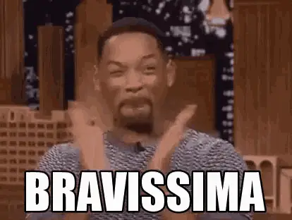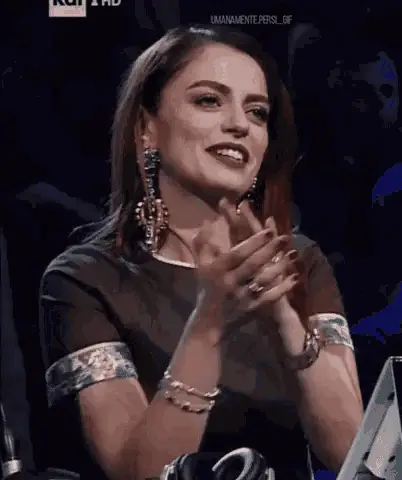 Rosy Di Carlo smiles and claps in front of a vibrant rainbow flag, looking directly at the camera.
