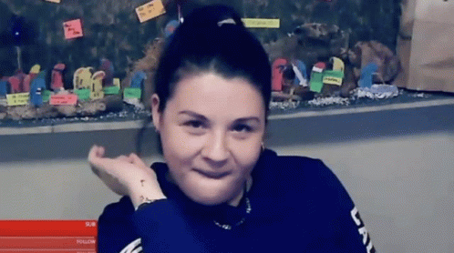 Rosy Di Carlo smiles and points directly at the camera, wearing a blue hoodie with 'USA' on it.