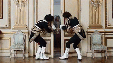 Beyoncé makes a grand, royal entrance, revealed by two men in elaborate uniforms opening ornate doors.