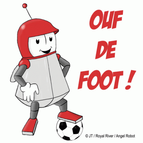 Royal River Angel Robot cartoon character playing soccer with the phrase 'Ouf De Foot!'.