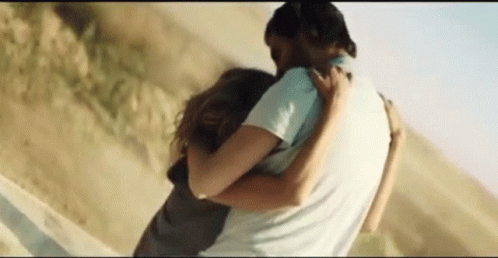 Ukrainian singer Rozhden Anusi embraces a woman on a sandy hill, sharing a moment of comfort and love.