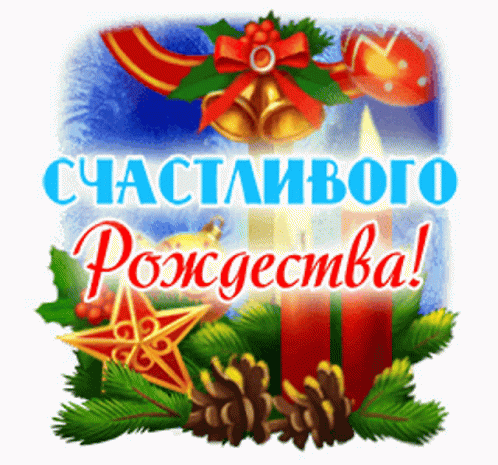 A festive Christmas card featuring lit candles, golden bells, and pine cones, with a 'Happy Christmas' message in Russian.