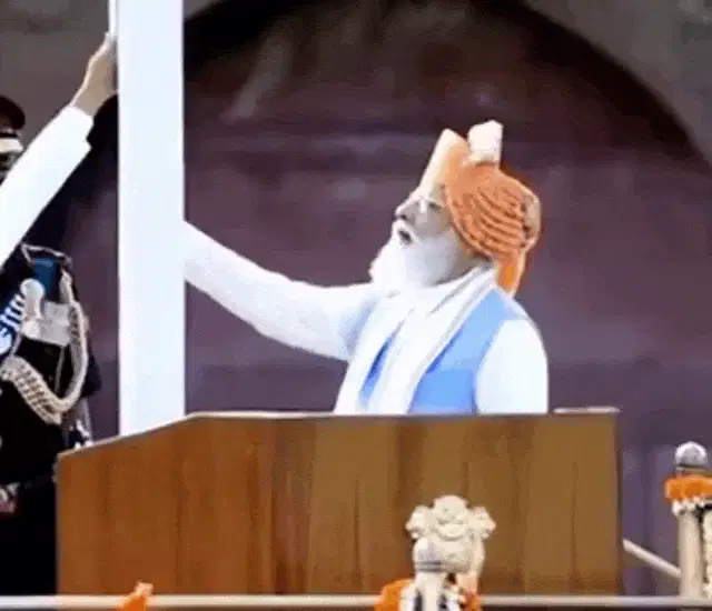 The vibrant green and saffron flag of the BJP, featuring a lotus symbol, waves in the wind, associated with Rss Modi.