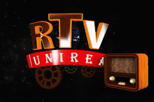 Animated logo reveal for RTV Unirea International, featuring a vintage radio, globe, and gears.