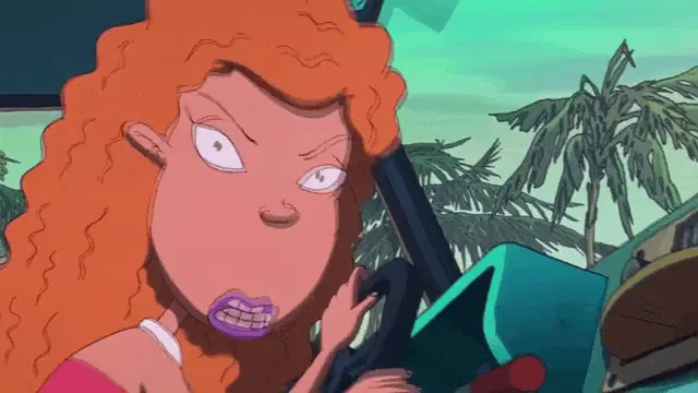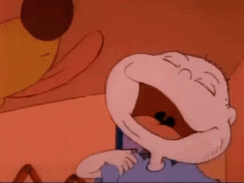 A Rugrats baby, Tommy Pickles, playfully licks a dog's nose in this classic Nickelodeon scene.