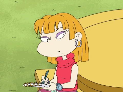 Angelica Pickles from Rugrats All Grown Up writing intently in a spiral notebook.