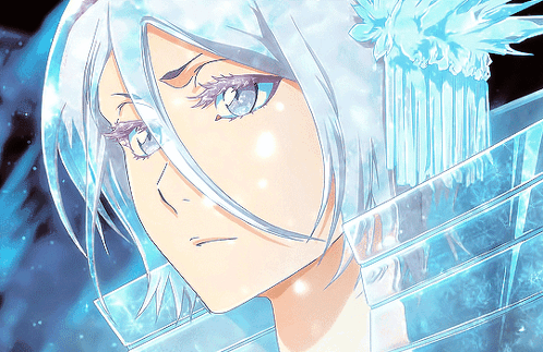 Rukia Kuchiki's stunning Bankai transformation from Bleach, featuring her white hair and blue eyes.