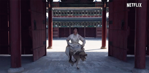 Bae Doo Na as Seo Bi runs through a grand palace courtyard in the Netflix series Kingdom.