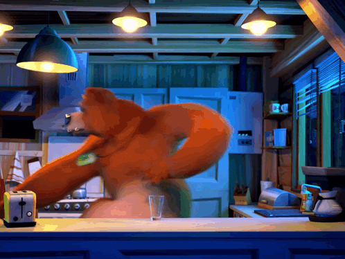 Grizzy and the Lemmings run away from danger in the kitchen, featuring an orange bear and blue lemmings.