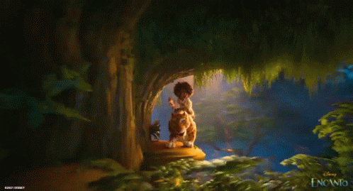 An Encanto character rides a speedy leopard through a lush, magical jungle environment, showcasing a fast-paced adventure.