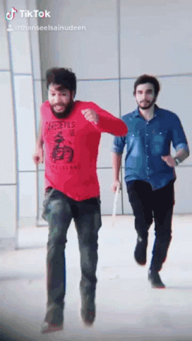 Two men in red and blue shirts running side-by-side with playful expressions, featuring a glitch effect.