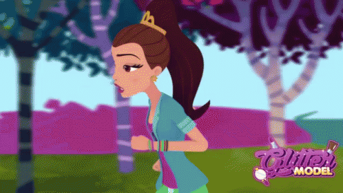 Animated girl with a ponytail running in a park, with the "Glitter Model" logo visible.