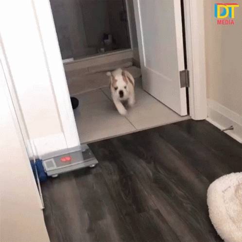 A cute bulldog puppy runs across a hallway and hilariously slips near its dog bed.