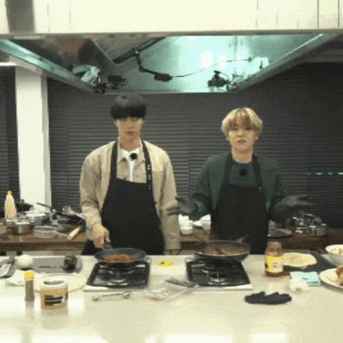 BTS members Jin and Suga look confused while cooking in the kitchen during an episode of Run BTS!.