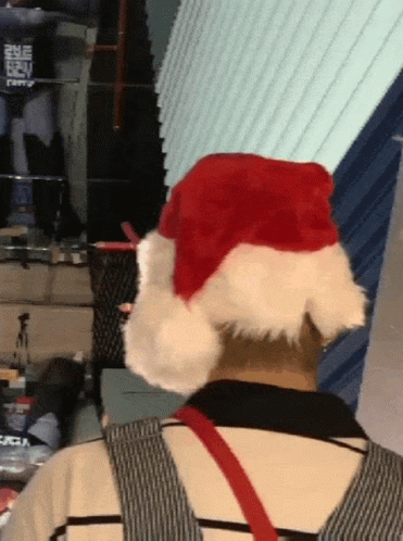 BTS member Taehyung, wearing a festive Santa hat, turns around with a visibly shocked expression.
