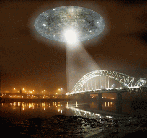 A giant UFO hovers over the illuminated Runcorn Bridge at night, casting a bright beam of light.