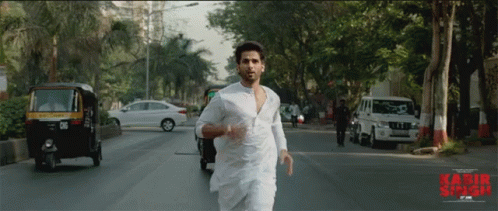 Shahid Kapoor runs urgently down a busy street in a scene from the movie Kabir Singh.