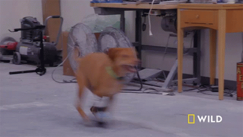A dog with a prosthetic limb joyfully runs across a room, featured by National Geographic Wild.