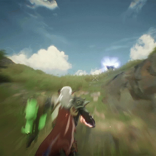 A character in a red cape races through a vibrant green landscape towards a glowing blue triangular portal in the sky.
