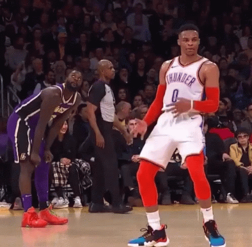 NBA star Russell Westbrook performs an air guitar move on the court, trolling an opponent.