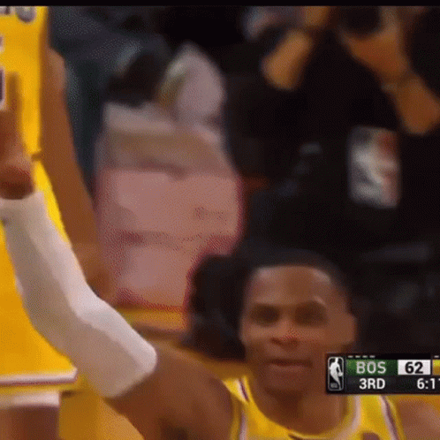 Russell Westbrook, wearing his Lakers jersey, raises his arm in celebration during a basketball game.