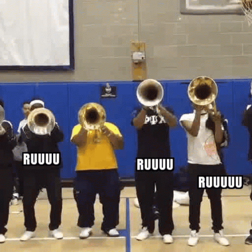 A marching band section playing brass instruments, chanting 'Ruuuu' in a gymnasium.