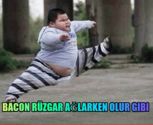 A humorous meme featuring a child in a martial arts pose with the Turkish caption 'Bacon Rüzgar Ağlarken Olur Gibi'.