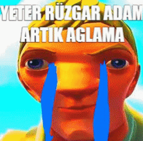 Rüzgar, the blue-skinned character, cries orange tears with the text 'Enough Wind Man, stop crying now'.