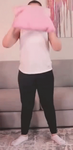 Mina Alsheikhly demonstrates a squat exercise using a pink pillow for home fitness.