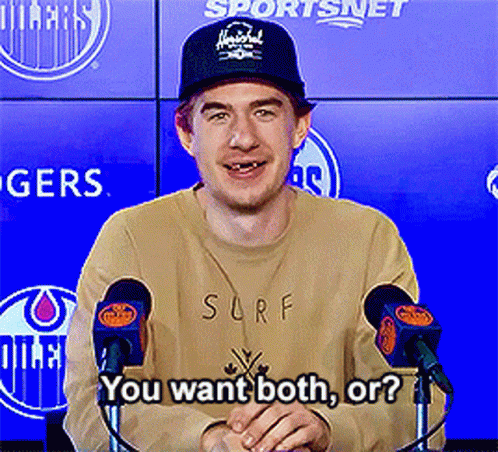 Ryan McLeod smiles and asks 'You want both, or?' at a press conference, wearing a Herschel hat.