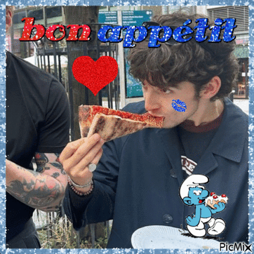 Ryan McMahon from the band Inhaler enjoys a slice of pizza, with 'Bon appétit' text overlay and a Smurf graphic.