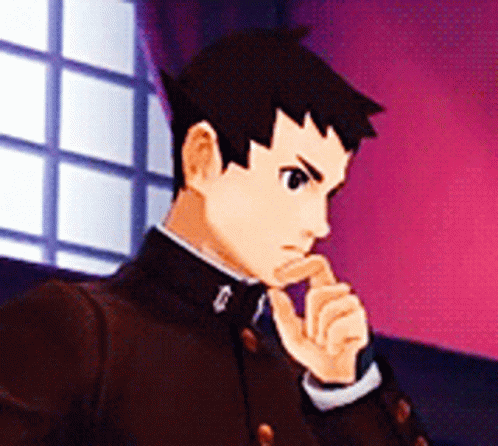 Ryunosuke Naruhodo from Dai Gyakuten Saiban thoughtfully touches his chin, deep in contemplation.