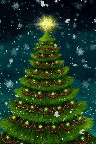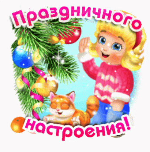 A cheerful cartoon girl and her cat celebrate near a decorated Christmas tree, wishing a festive mood.