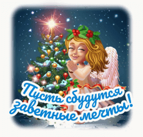 a christmas card with an angel standing next to a christmas tree and the words " пусть сбудется заветные мечты "