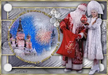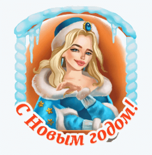 Festive Snegurochka sticker wishing a Happy New Year, featuring a blonde woman in a blue and white snow costume.
