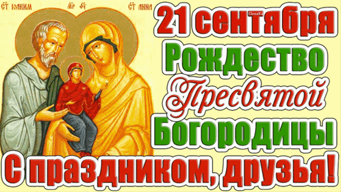 A Russian greeting card celebrating the Nativity of the Most Holy Theotokos on September 21, featuring Orthodox iconography.