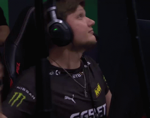 S1mple adjusts his headphones and reacts during a CS:GO match, wearing his NAVI team shirt.