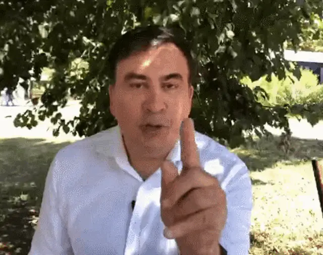 Mikheil Saakashvili speaking outdoors, gesturing with his hands in a thoughtful manner.