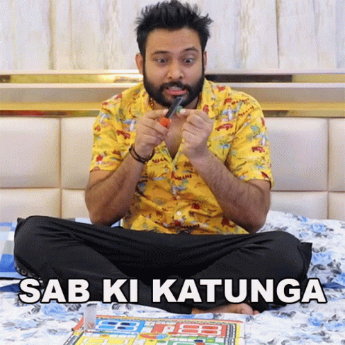 Pankaj Sharma sits on a bed, holding a knife-like object, with 'Sab Ki Katunga' text, ready for Ludo.