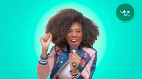 Sabrinadibynis passionately singing into a microphone, showcasing her beautiful afro hair with Salonline.