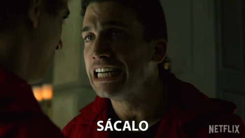 Jaime Lorente as Denver from La Casa De Papel intensely yells 'SÁCALO' in a red jumpsuit.