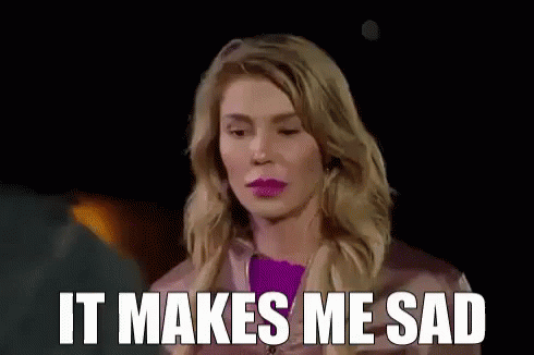 A woman with purple lipstick and blonde hair says "It makes me sad" with a sad expression.