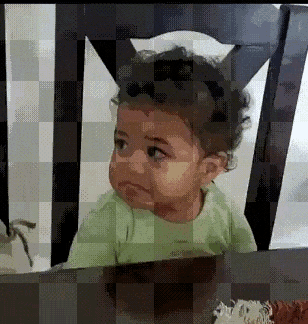 A cute baby with curly hair sits at a table, making a sad, pouty face.